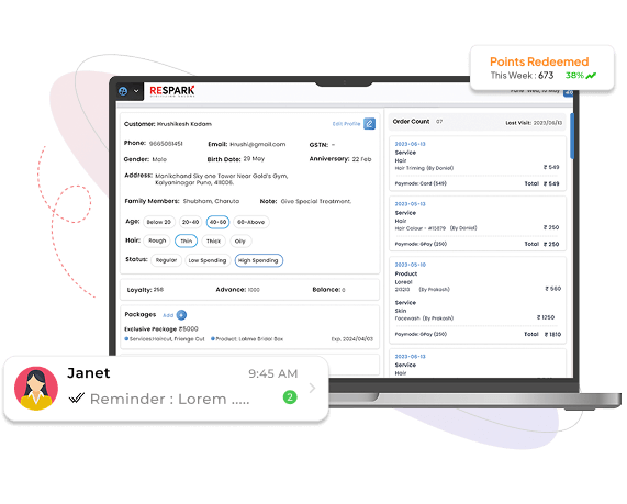 In the beauty and wellness industry, building strong client relationships is the key to repeat business. ReSpark’s salon CRM software helps salons, spas, and wellness centers build loyalty, improve communication, and personalize every visit. Whether you manage a boutique spa, multi-branch salon, or niche wellness studio, our salon CRM system helps you stay connected to your clients and their preferences. With automated birthday messages, service reminders, segmentation tools, and customer insights, ReSpark’s spa CRM software transforms how you engage and retain your clientele.